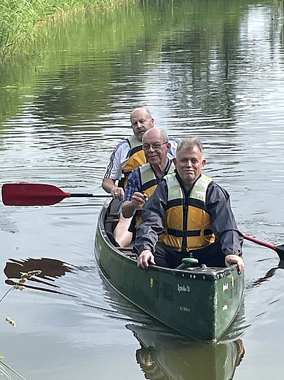Dank der betriebseigenen sechs Kanus und der engagierten Organisation durch Frank Diekmann und Dietmar Horstmann startete die Gruppe um 16 Uhr am Dümmer. Ruhig und entspannt ging es auf dem Wasser Richtung Pausenplatz kurz vor Diepholz – bei bestem Wetter und in ausgeglichener Stimmung.