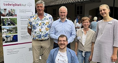Bürgermeister Henning Vieker (Zweiter von links) und Fördervereinsvorsitzender Jan-Dirk Jungvogel (Erster von links) freuen sich zusammen mit Katrin Kischkel, Ina Böker (Dritte und Vierte von links) und Michael Biesewinkel (vorne) vom Ludwig-Steil-Hof) über die vielfältigen Angebote und die breite Beliebtheit des Seniorenbüros in Espelkamp.